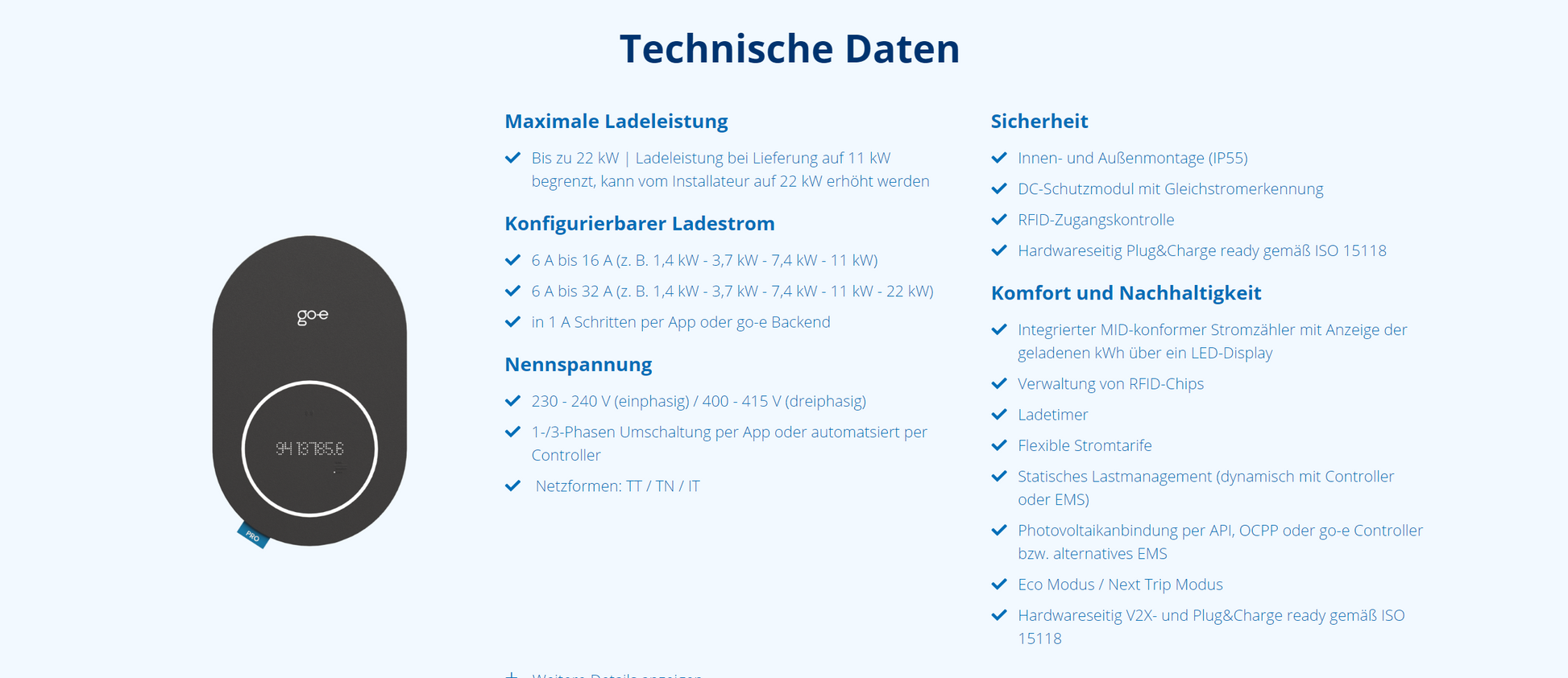 Der go-e Charger PRO mit integriertem MID-konformen Zähler adressiert u.a. die Bedürfnisse von Unternehmen, Flotten, Dienstwagenfahrer*innen, die zu Hause laden oder Mehrparteienhäusern. Die stationäre Wallbox mit sämtlichen von go-e bekannten smarten Features ist zudem gemäß ISO 15118 V2X ready sowie Plug & Charge ready und bietet mit diesen Neuerungen noch mehr Ladekomfort und Effizienzgewinn. Ladeleistung: von 1,4 kW bis 11/22 kW je nach Anzahl der Phasen (1-phasig, 3-phasig)